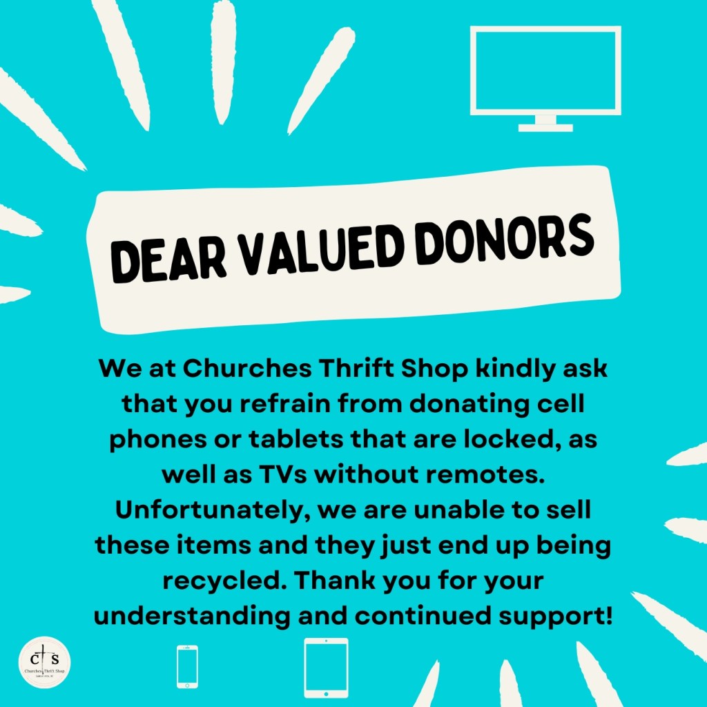 We at Churches Thrift Shop kindly ask that you refrain from donating cell phones or tablets that are locked, as well as TVs without remotes. Unfortunately, we are unable to sell these items and they just end up being recycled. Thank you for your understanding and continued support!