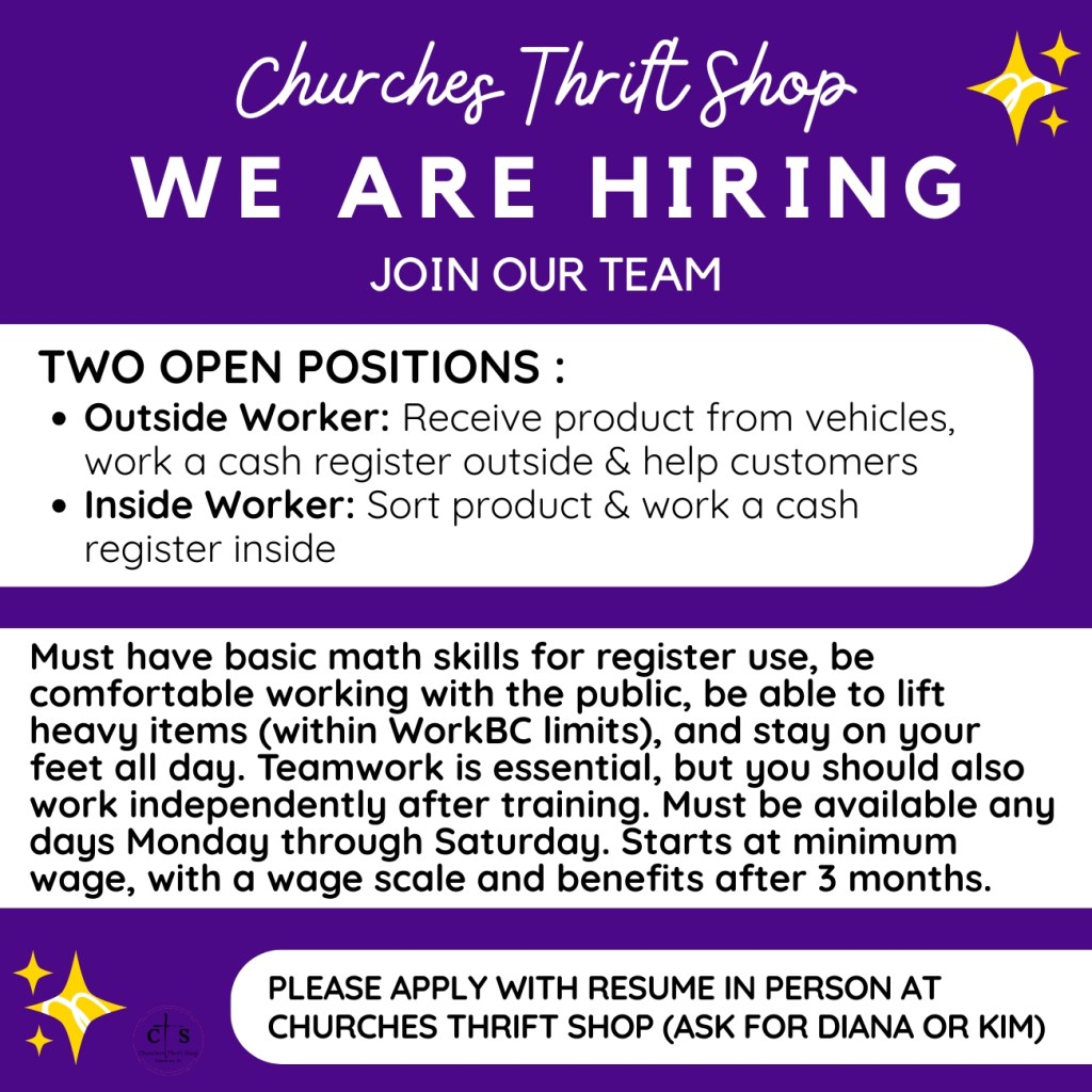 Please apply with resume in person at Churches Thrift Shop (ask for Diana or Kim).