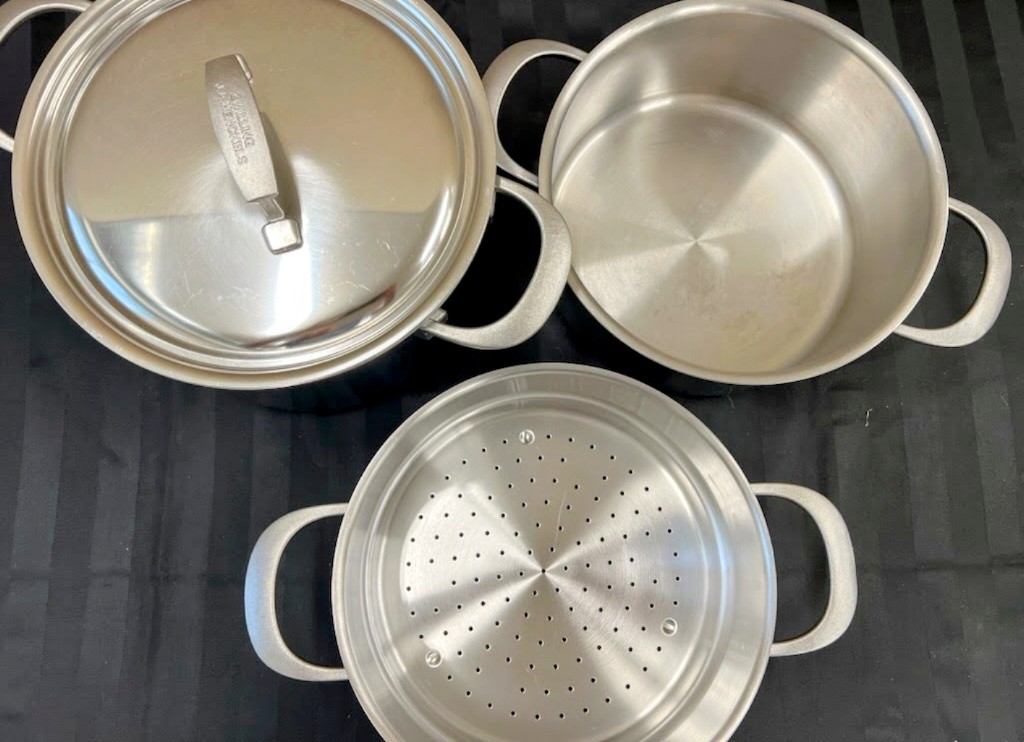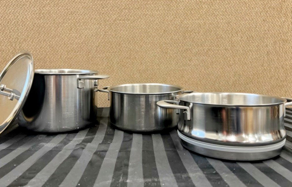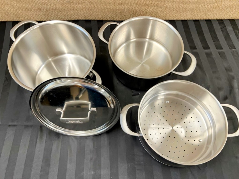 3-quart stainless steel saucepan, 2-quart stainless steel saucepan, and stainless steel strainer with 1 lid.