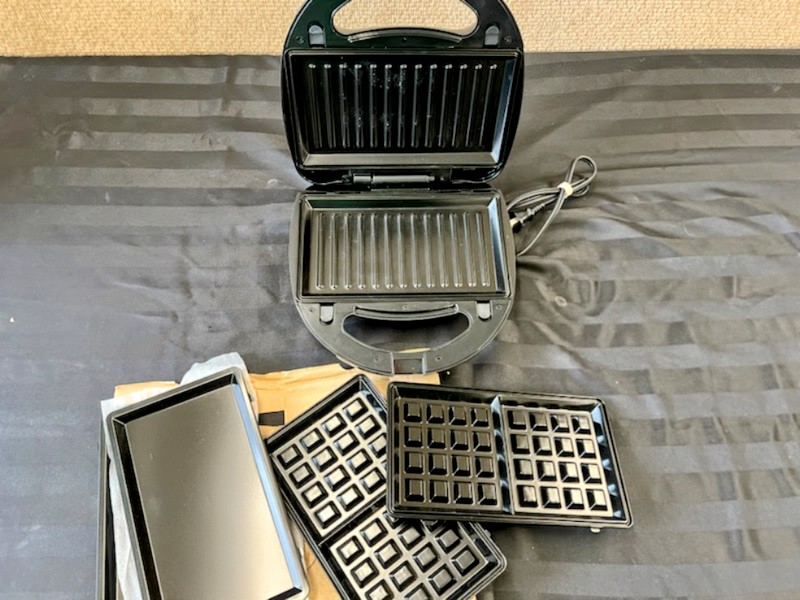 With 8 interchangeable plates: waffle, grill, sandwich and griddle.
