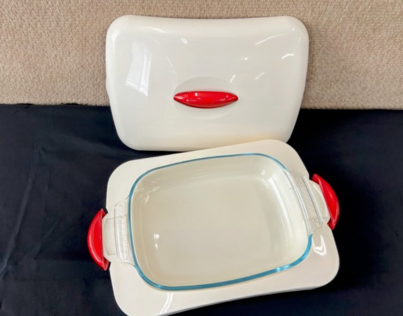 THERMOS Insulated Casserole Carrier with a glass baking dish that measures 9×11.