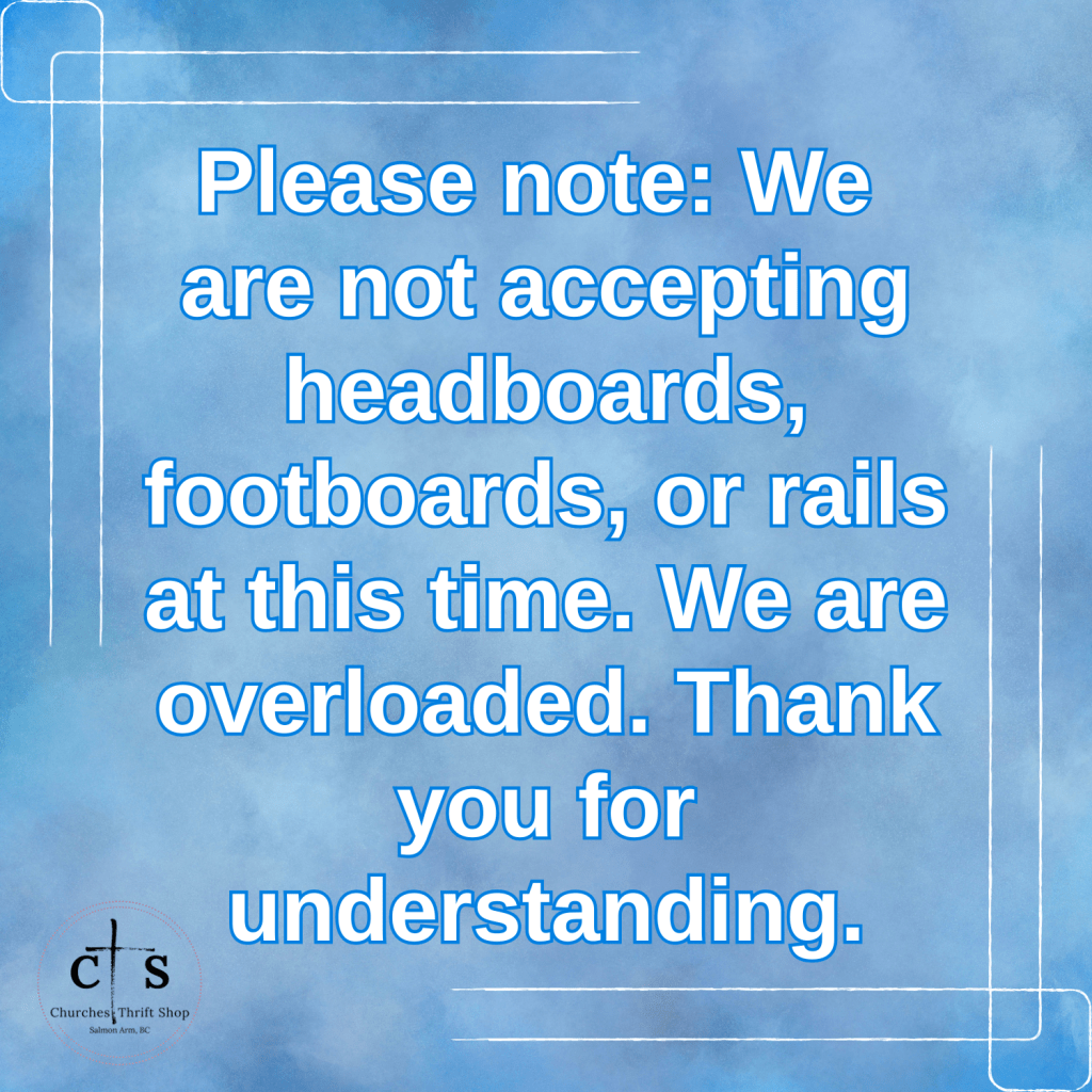 News and EventsWe Are Not Accepting Headboards, Footboards, or Rails at This Time August 30, 2025 churchesthriftshop Please note: We are not accepting headboards, footboards, or rails at this time. We are overloaded. Thank you for understanding.