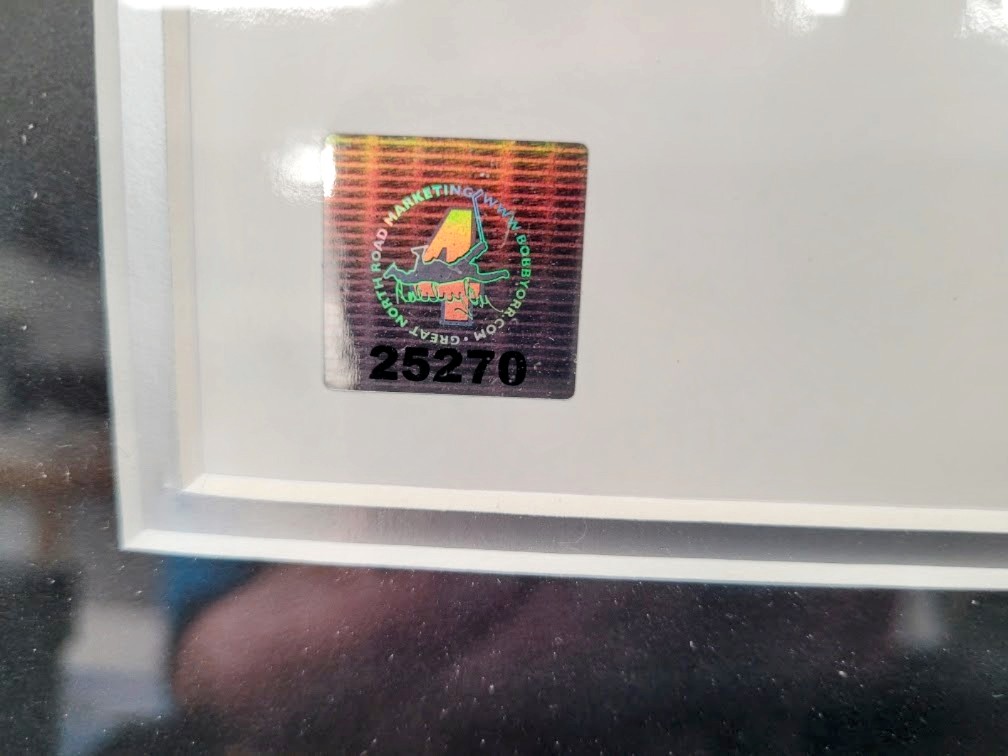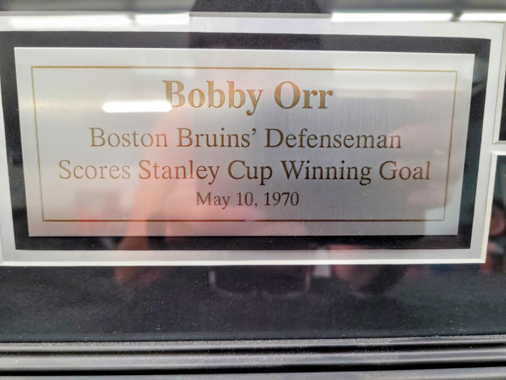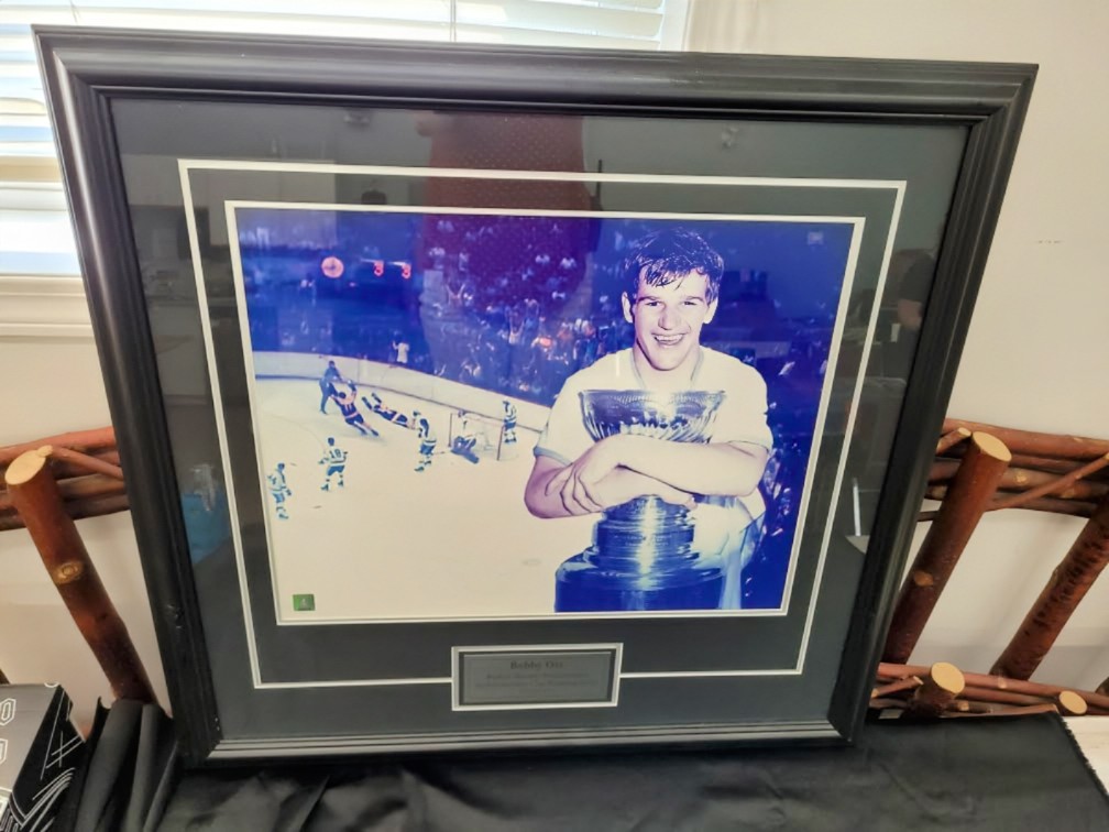 This framed photograph captures Bobby Orr’s iconic “flying goal” from the 1970 Stanley Cup Finals, where he scored the overtime winning goal for the Boston Bruins against the St. Louis Blues.