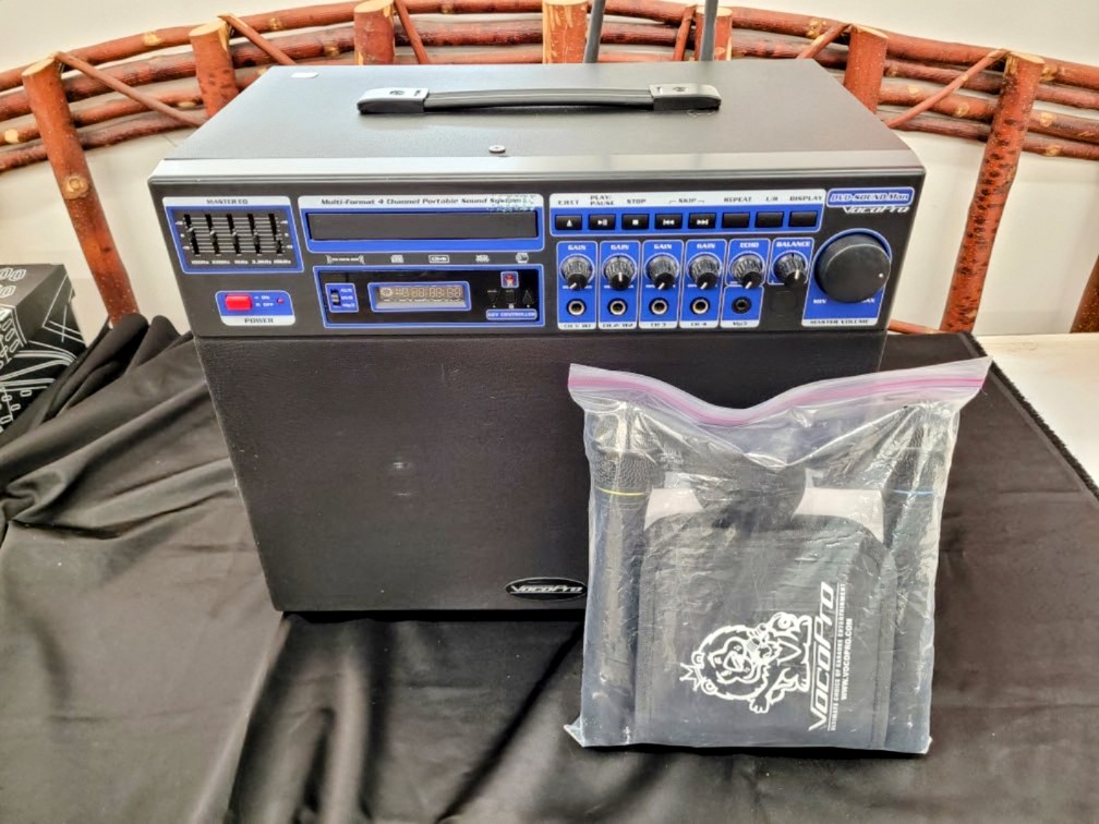 This is a compact and versatile all-in-one PA and karaoke system. Comes with 2 microphones & instructions.
