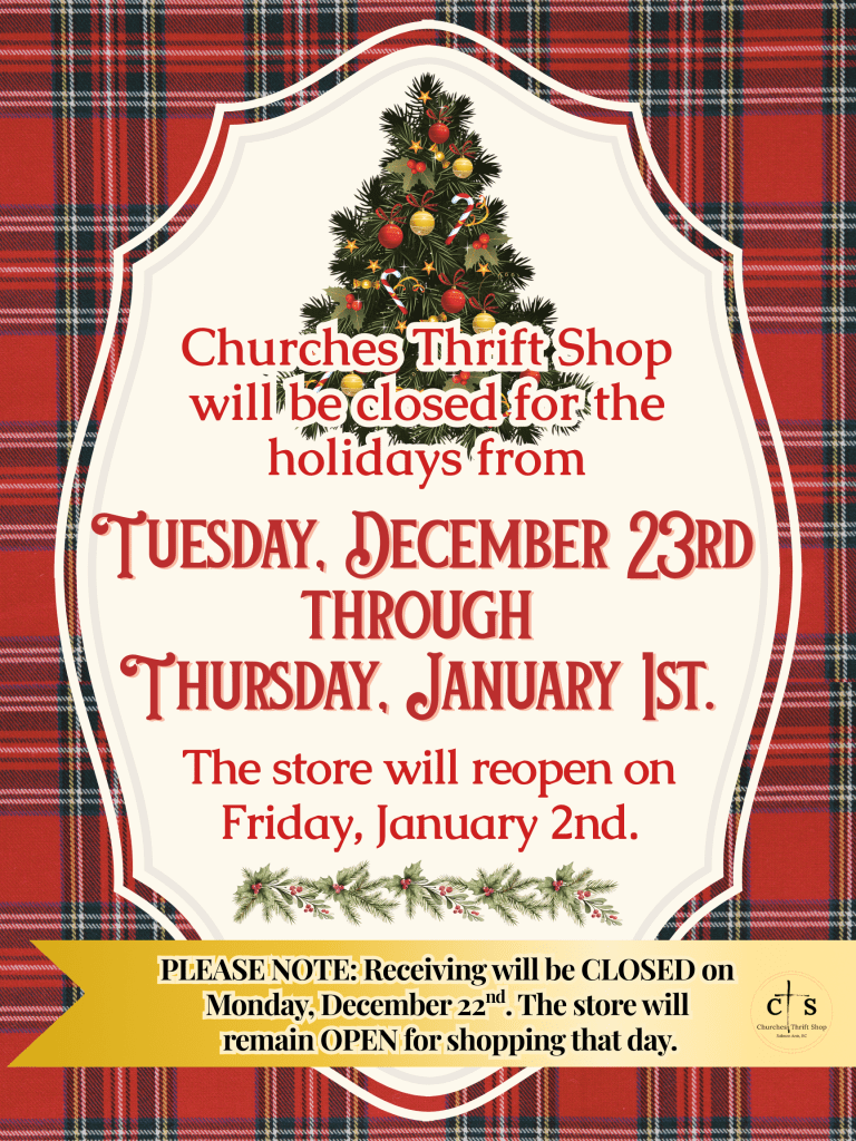 Churches Thrift Shop will be closed (for shopping) for the holidays from Tuesday, December 23rd through Thursday, January 1st.