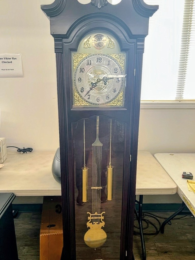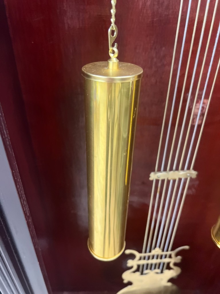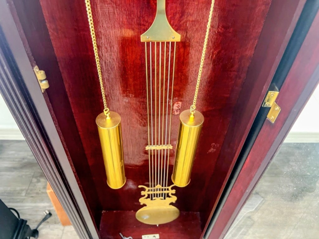 Please note that these (see photos below) are just decorative. The pendulum swings with the ticking of the clock. It also has some scratches on it. The starting bid is set accordingly.