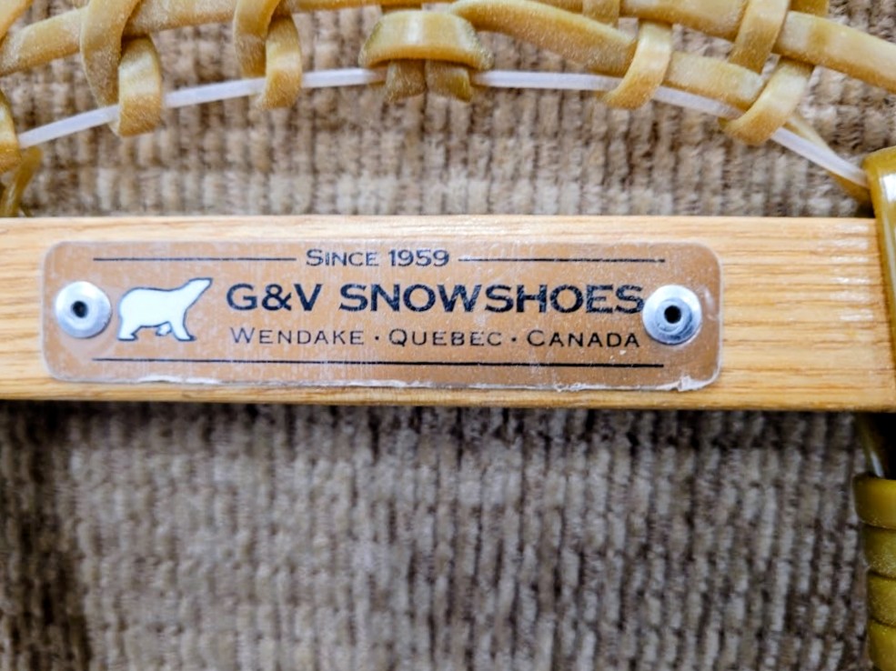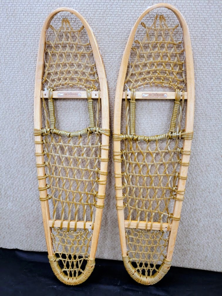These snowshoes feature a classic design with an ash wood frame and synthetic lacing.