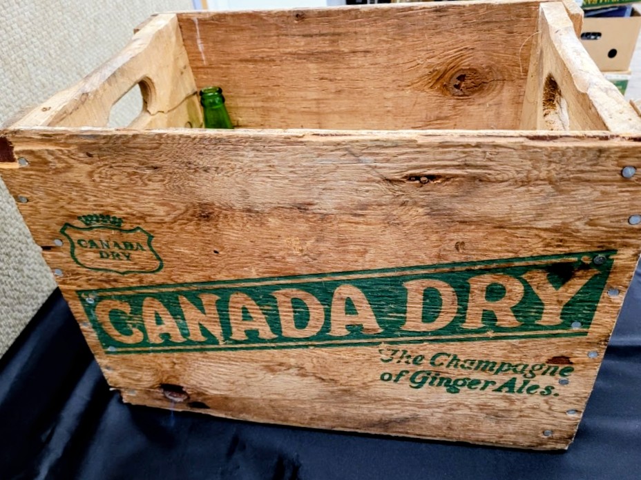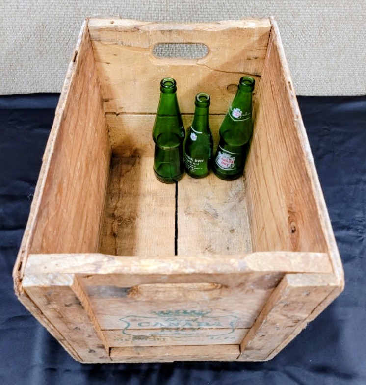 Vintage wooden Canada Dry crate (branded “The Champagne of Ginger Ales”). Includes 3 green glass bottles (as shown).