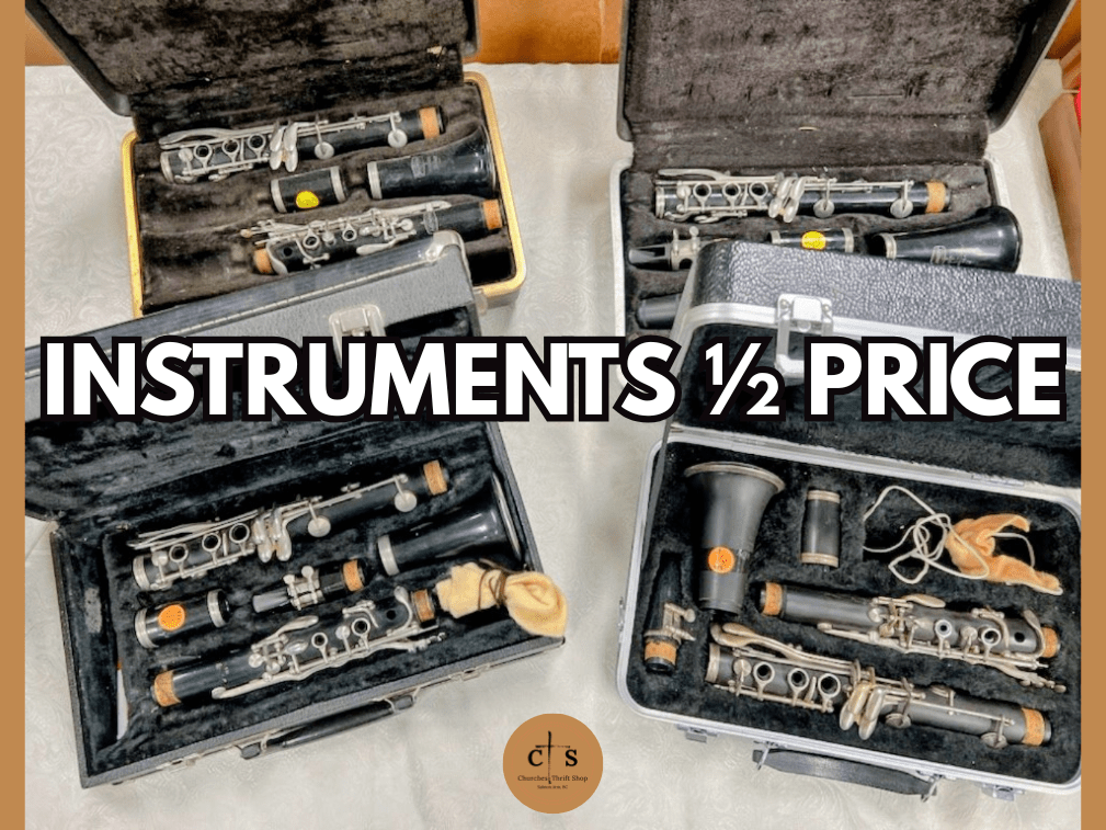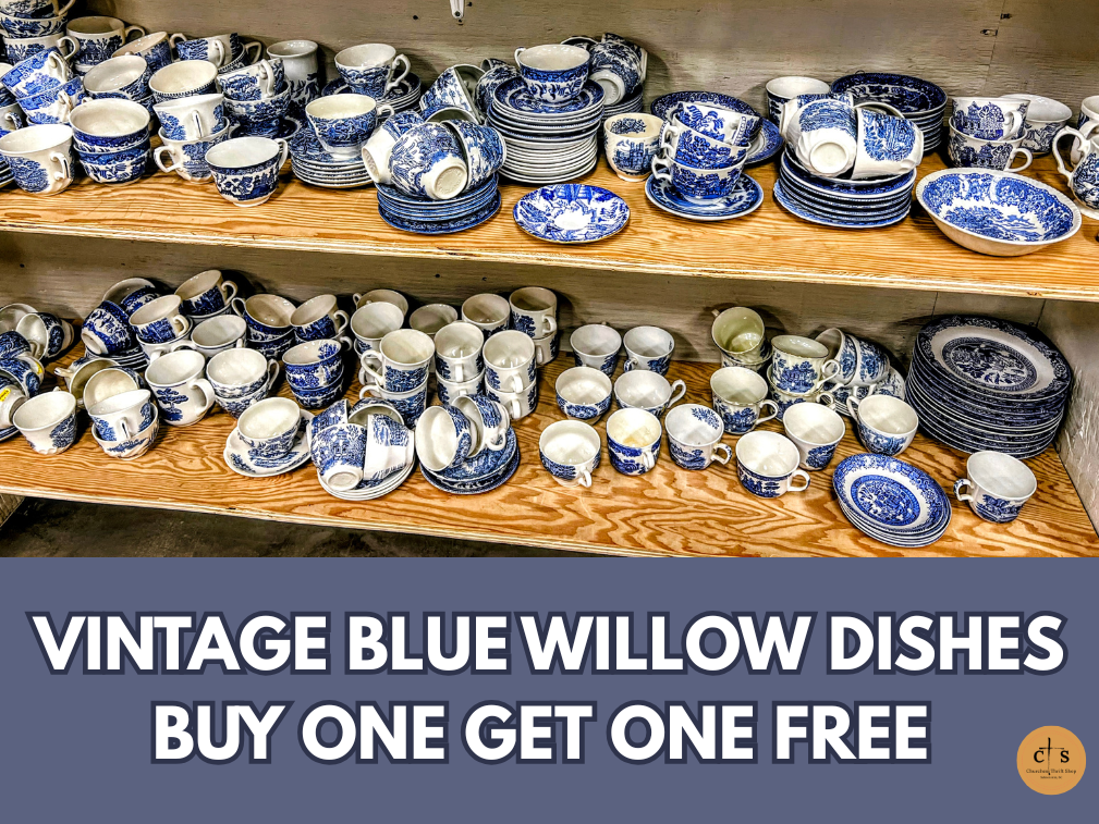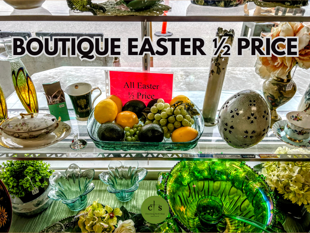 News and EventsSales on Now! April 6, 2026 churchesthriftshop Instruments 1/2 Price Vintage Blue Willow Dishes Buy One Get One Free Boutique Easter 1/2 Price