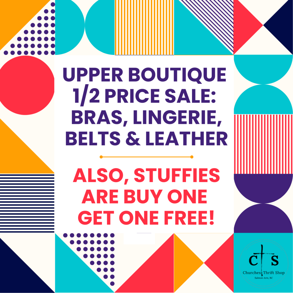 News and EventsSales on Now! April 14, 2026 churchesthriftshop Upper Boutique 1/2 price sale: Bras, lingerie, belts & leather. Also, stuffies are buy one get one free!