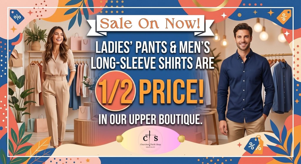 News and EventsLadies’ Pants & Men’s Long-Sleeve Shirts are 1/2 Price in Our Upper Boutique!! April 16, 2026 churchesthriftshop